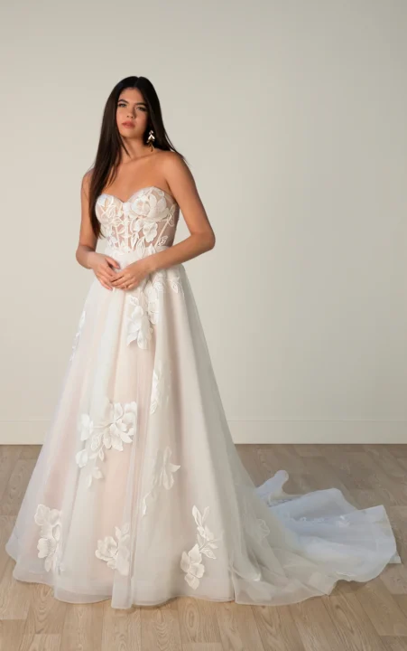 Let us tell you about a gown that embodies everything we love about contemporary bridal design: Stella York Style 7975. This stunning creation is a masterclass in chic sophistication. The moment you slip into this gown in our bridal suite, you’ll feel the difference that expert design makes. The sculpted strapless bodice features a modern sweetheart neckline that’s both flattering and fashion-forward, while the sheer corset-style construction creates a tailored effect that beautifully accentuates your natural silhouette. Available in a range of sizes, including EveryBride options from 18 to 34, this gown ensures every bride finds her perfect fit.