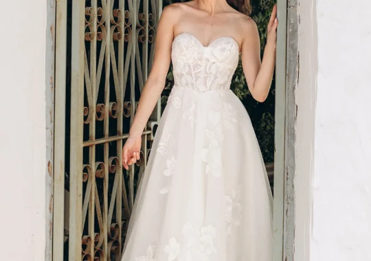 Essense of Australia’s “D3247” combines romance and elegance with a bold floral lace over a soft crepe skirt. “D3247” will truly stand out while walking down the aisle, and the dramatic train will impress your wedding guests.